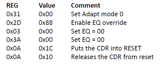 Reg 0x2F[7:4] = 1100'b // Set lock rate for Interlaaken-2 (10.3125 Gbps with Divide-by-1 VCO divider only)