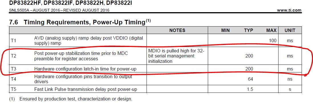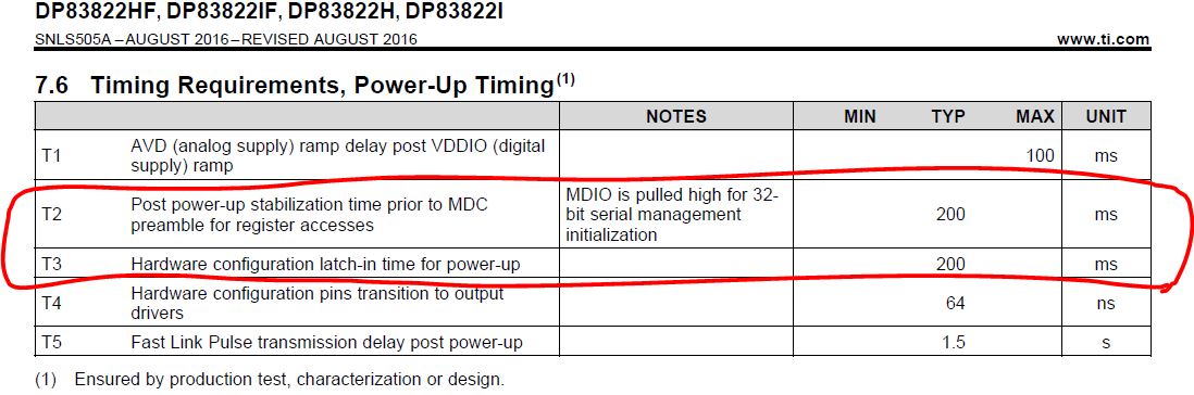 With reference to page 10 of DP83822H data sheet (7.6 Power-Up Timing), extracted as below. The typical hardware power up timing for T2 and T3 is 200ms. Customer asked if we have more data for this parameter to share ? They are interested in the max value.
