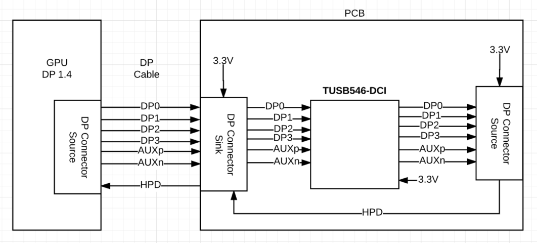 The following block diagram illustrates my target design which is very similar with the DP141RLJEVM DP141Evaluation Module Board(which support DP 1.3).