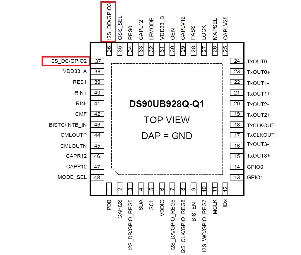 We will use the combination of DS90UB927(TX) and DS90UB928(RX), and GPIO[3:0] of DS90UB928 will be used and configured to output ports.