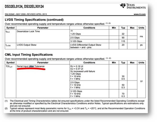 The way we read the “CML Input Timing Specification” for the “Serial Input Jitter Tolerance” parameter for a 3.125Gbps data rate is: