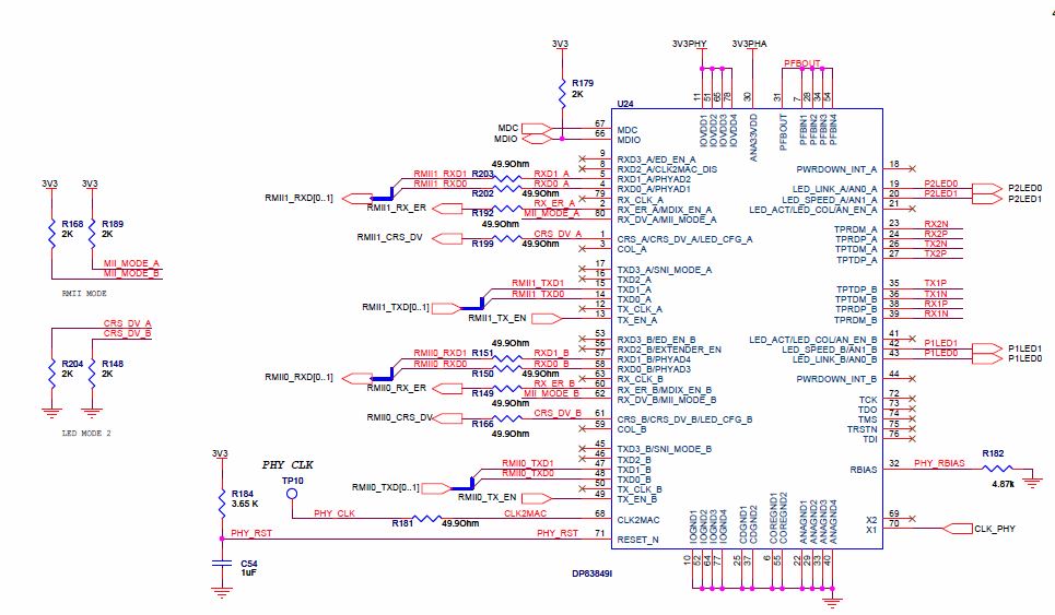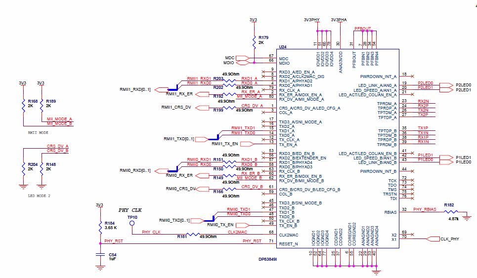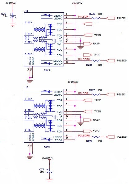 LED_LINK_A/AN0_A and LED_LINK_B/AN0_B once in a while detect wrong polarity and would be OFF when the LINK is established and shortly blink ON on activity. When the cable is disconnected the LED would be ON. With s/w or h/w reset or power cycle it usually is back to normal.