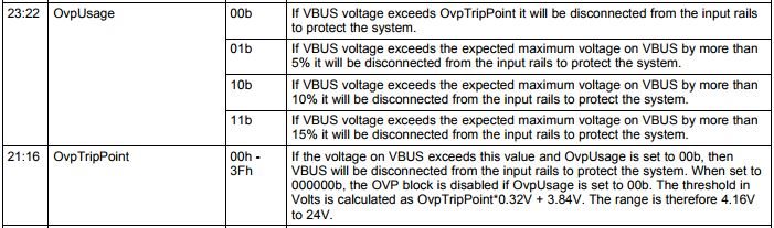 If OvpUsage is set to 00b, you can manually enter an OVP trip point in the OvpTripPoint field. Otherwise, you can set the OvpUsage field to trigger an OVP when the VBUS voltage exceeds either 5%, 10%, or 15% of the expected maximum on the current PDO.