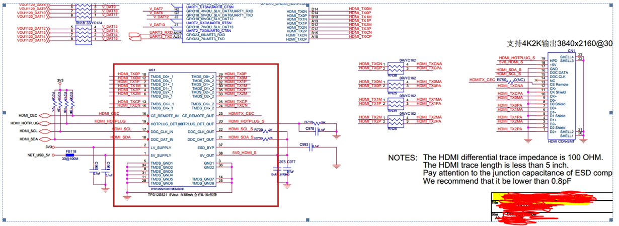 My customer is using our HDMI ESD. Recently, they found 20 in 500 products' HDMI port broken in field application. During testing, the differential lines shorted to ground, but strange is that our ESD IC still good. Seems ESD protection IC doesn't protect our HDMI? Below is the sch. Do you have any suggestions for the reason or sch comments?
