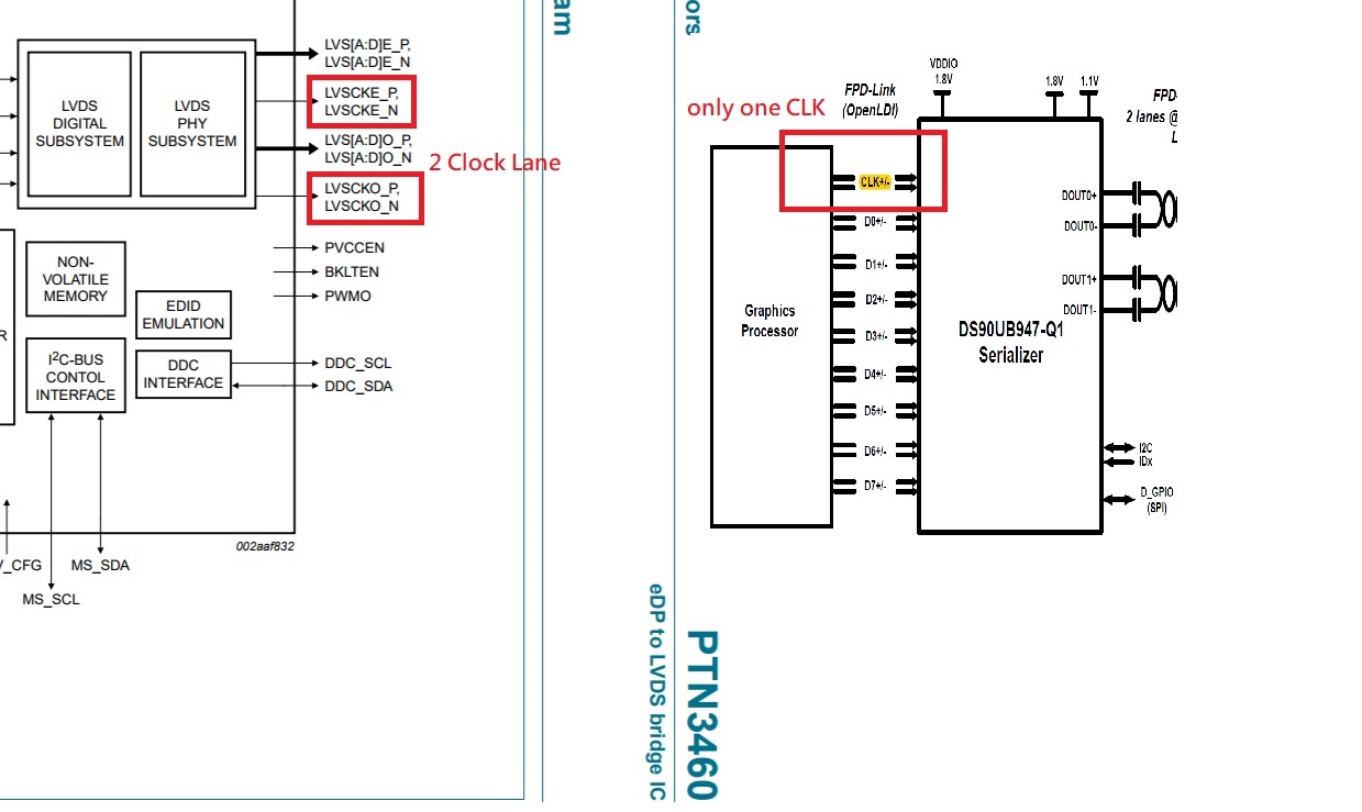 PTN3460 have 2 clock lane output ,but DS90UB947 have only one clock input