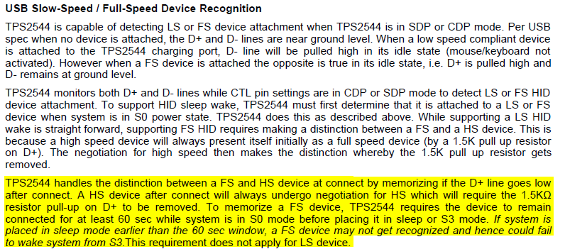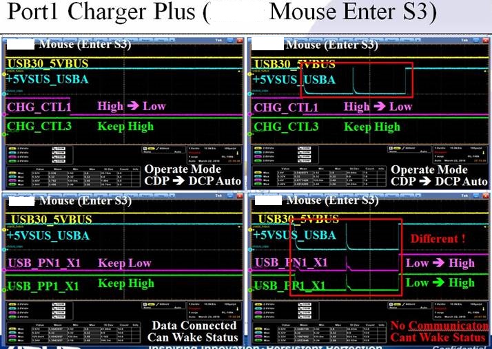 My customer is facing an issue which is related to wake up event of TPS2544. Please kindly see below waveform for successfully wake-up(left)/fail wake-up(right) event. We used the same mouse and PC to test. For the failure wake-up event, VBUS drops and D+ drop. And D+/D- will keep both high so that host cannot know that device is plugged in.