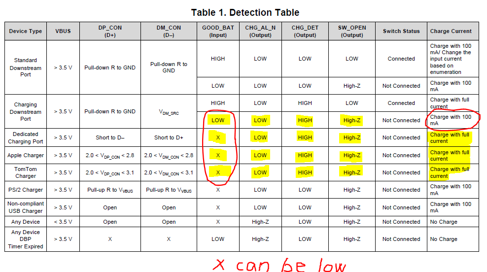 I would assume that it is fine to charge with full current (up to 1500mA) when CHG_AL_N is LOW and CHG_DET is HIGH like also stated in BQ24392 spec Table 2. Spec Table 1 is saying that one can not charge from CDP with full current when GOOD_BAT is LOW.