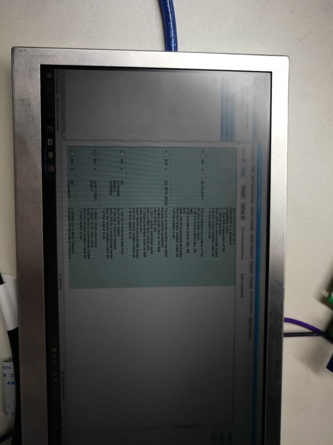 A, Why the PC HDMI output or i.max6 HDMI output 24bit RGB444 via 949EVM to 948 to screen display is anormai? if set 948 to 18bit bedio, it could show the content but the screen is very dim. if they don's do this setting, the display couldn't show anything. As figure show.