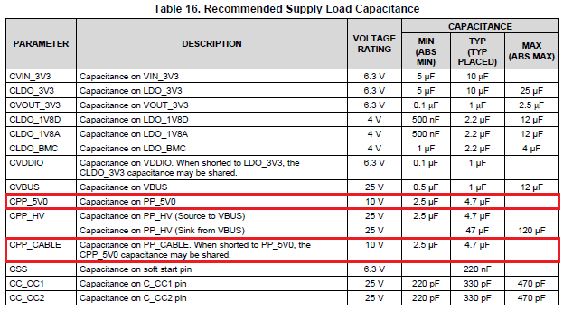 The datasheet shows 4.7uF(TYP) is recommended for CPP_5V0 and it may be shared with CPP_CABLE when PP_CABLE is tied to PP_5V0.