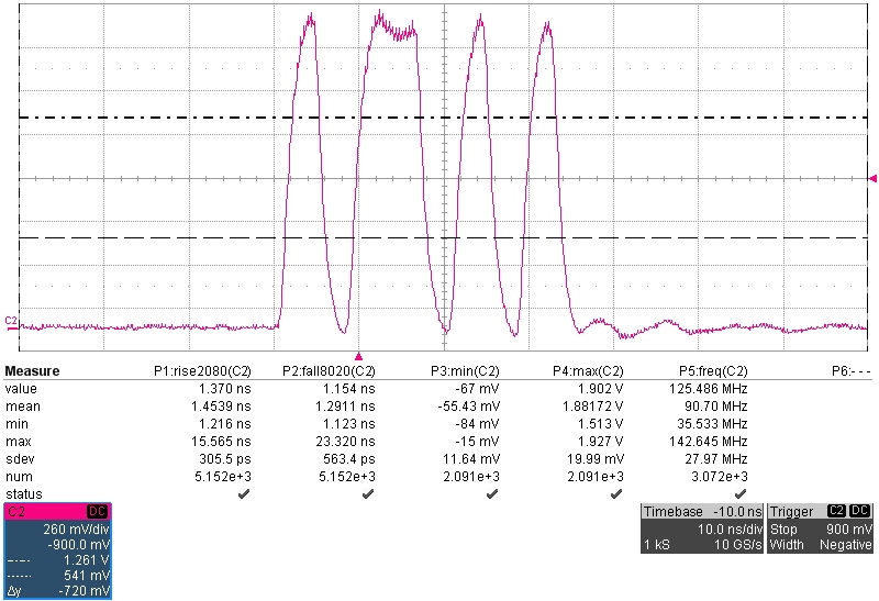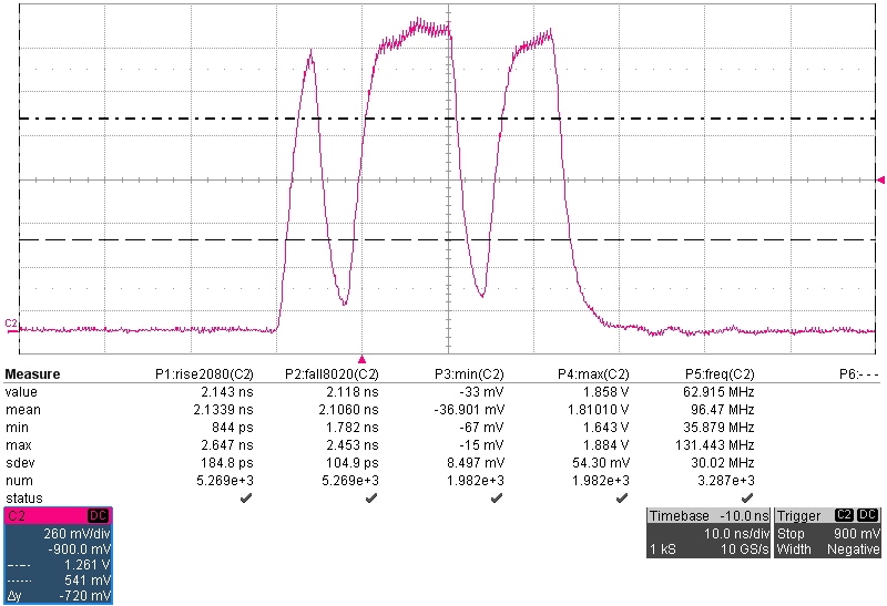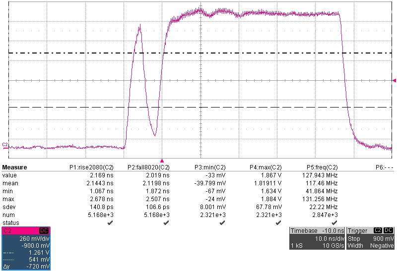 Customer is using the DP83867IS, that supports both RGMII and SGMII. They have seen that for the RGMII inputs, pins 27 and 28 slow down the input signal more than pins 25 and 26. This is even with SGMII disabled. Attached are measured signals for each and you will see that the dual purpose pins slow the signal to 2.1ns edge rates while the RGMII only pins are at 1.4ns. Any thoughts on what could be causing this?