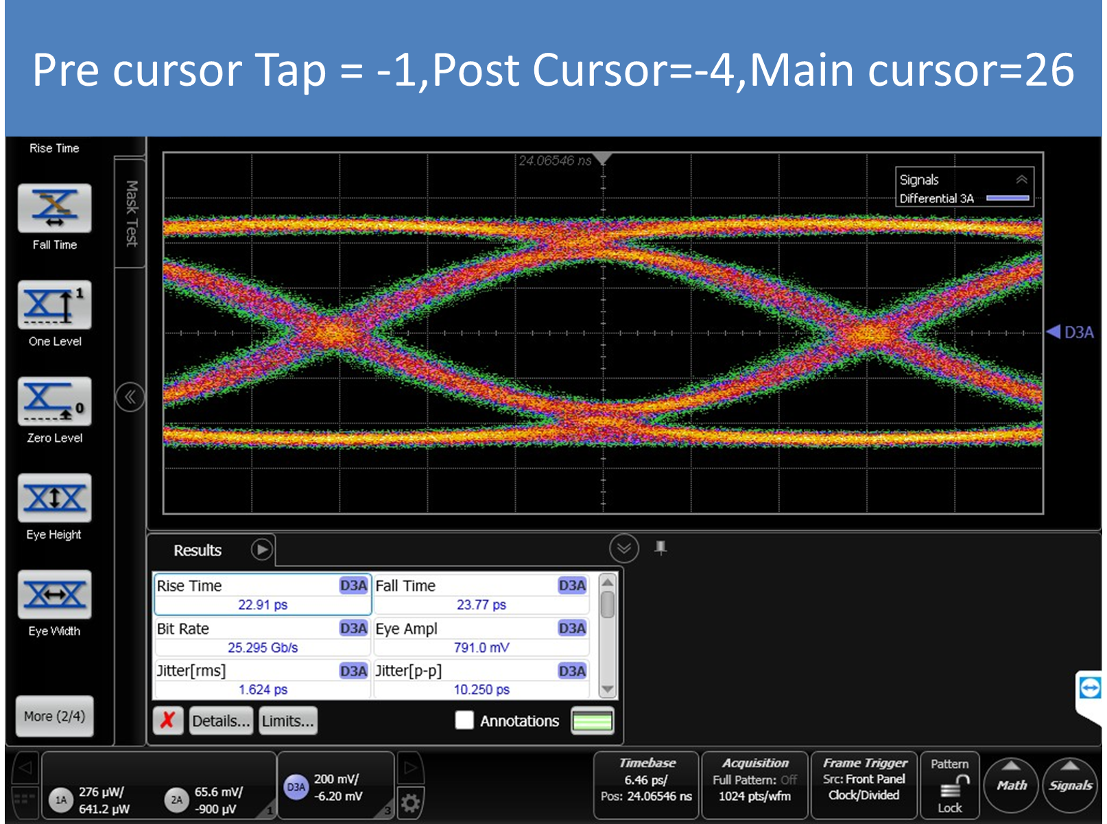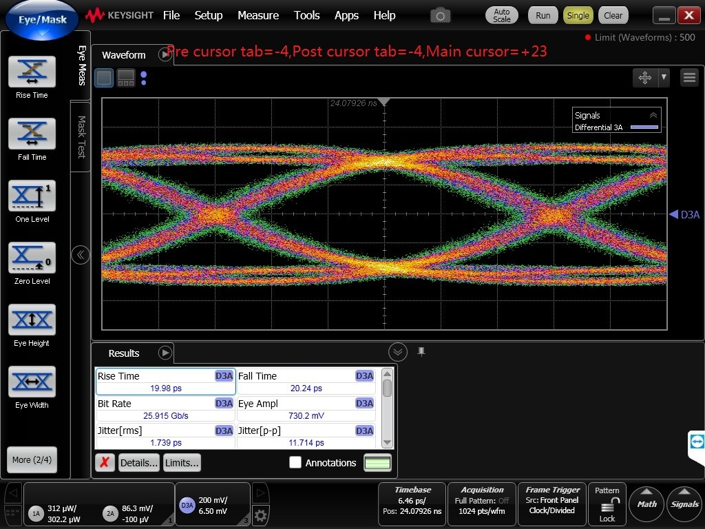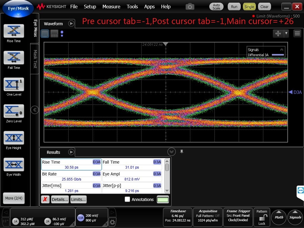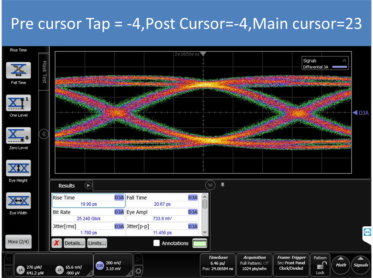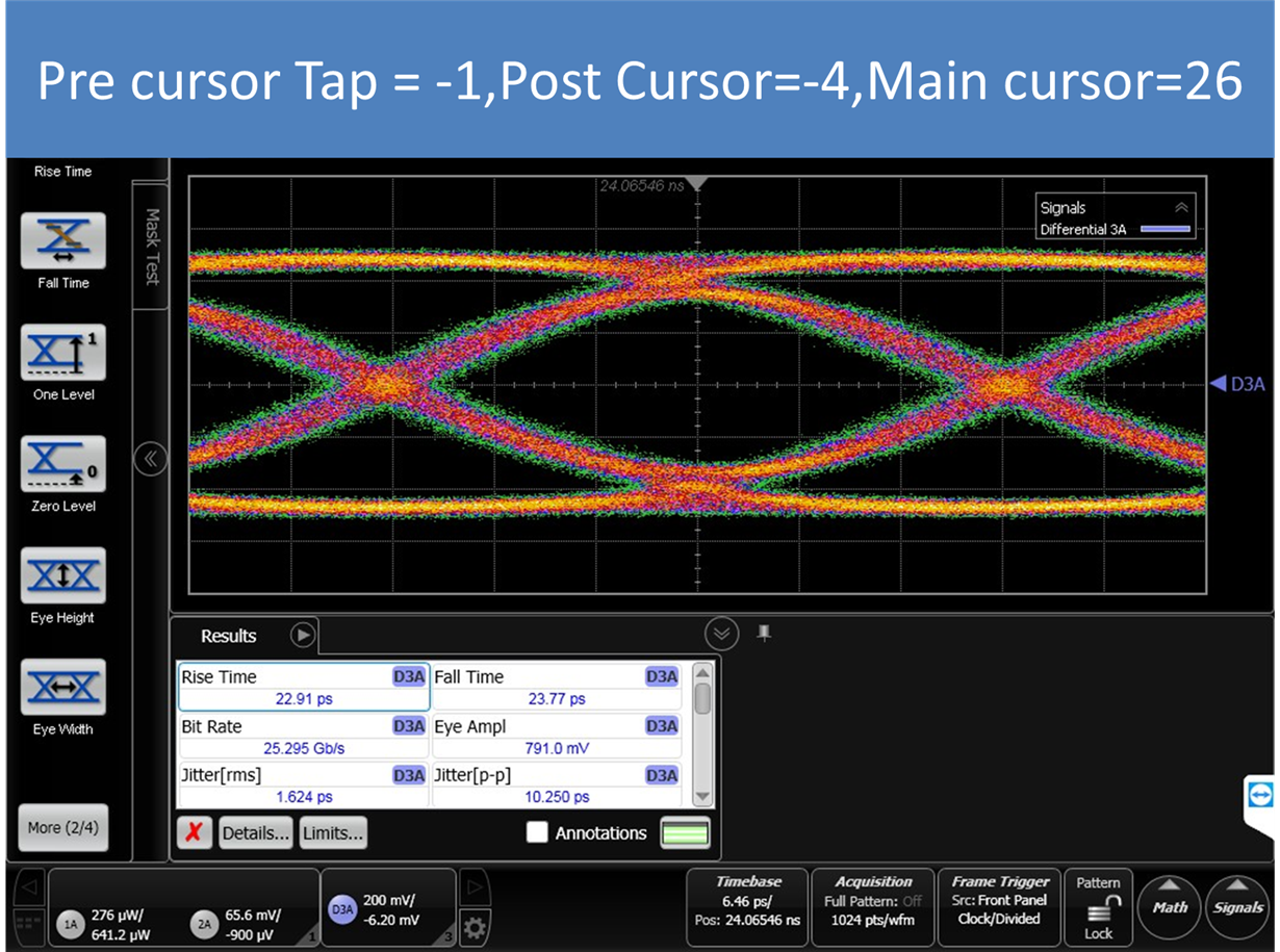 I used DS250DF410 as retimer,Input a PRBS31,25.78Gbps signal to RX0,and get a output in TX0,but the eye diagram output of TX0 is undershoot,when I set post and pre cursor ,the undershoot is missed,but the