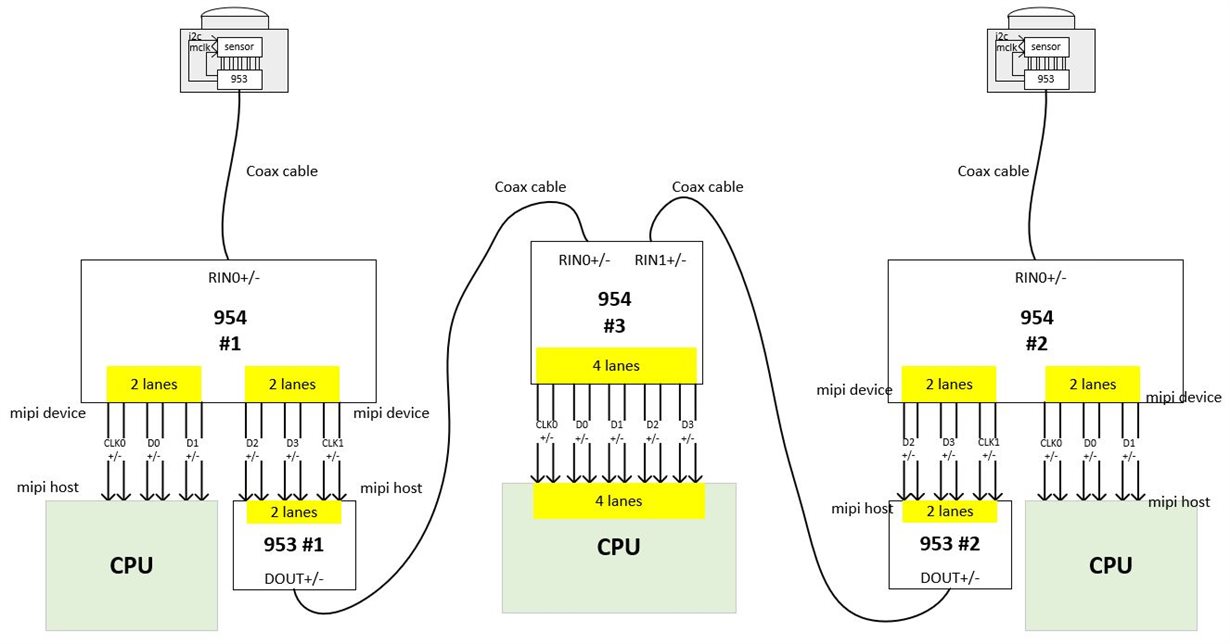 To complete the design above, if I add an additional input source to the middle 954, as shown in the attached figure, so that 954 #3 would receive two inputs from two seperate 953, and the input of each 953 is a 2-lane mipi csi2 port. I want the 954 #3 to aggregate the two 2-lane mipi source from 953#1 and 953#2 to a 4-lane mipi csi2 output, is this design OK?