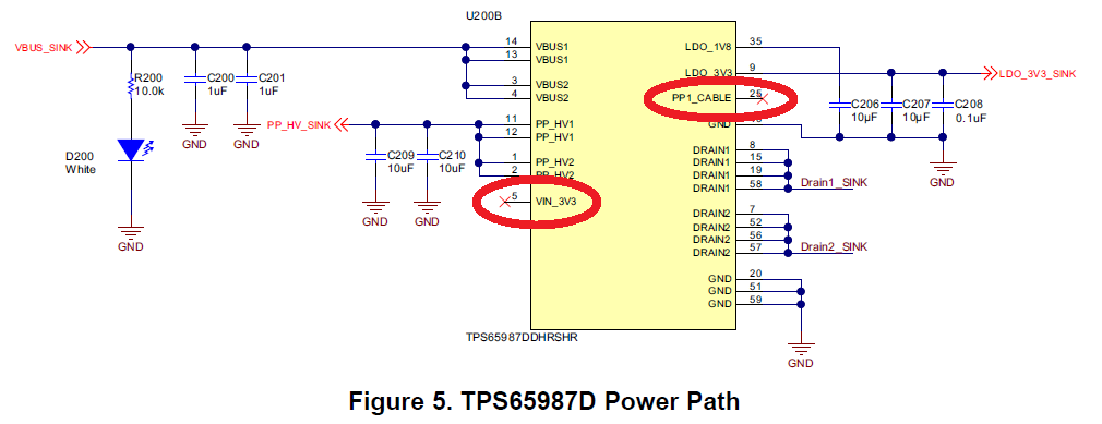 I read the article TIDA-050014, Power DUO Sink 200W USB-C PD Reference Design for reference to my design (Sink Only Device), where I found one odd, compared to the datasheet.