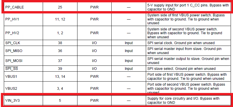 The pin 25 (PP_Cable) and 5 (VIN_3V3) are floats, while the datasheet says that pin 25 to external 5V and pin 5 to external 3.3V.