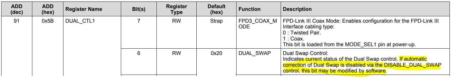 Also, in register 6 below, the description says, "If automatic correction of Dual Swap is disabled via the DISABLE_DUAL_SWAP control, this bit may be modified by software." What are the results of "modifying this bit by software"? What would the "modification" be? Does this also perform a swap function on the OLDI inputs?