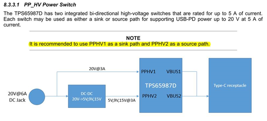 "If considering TPS65987D design, we will define PPHV1 and PPHV2 both as source path. I find there have recommendation wording about PPHV utilization. Do you have any concern about below desired power diagram?"