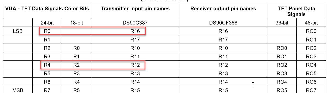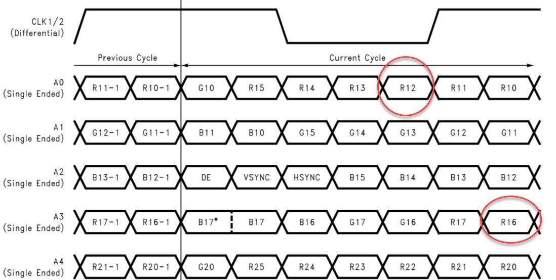 There is something wrong on the LCD display color, the pixel color is not as expected. In one experiment, we realized that there is bit poistion shift in LVDS output data stream. In the experiment, only R14 is set at "1", all other data bit are set to "0". As we can see from below oscillscope waveform, the bit R14(which is "1") is shifted to the poisition of R12. Please advise the possible reason of this issue??