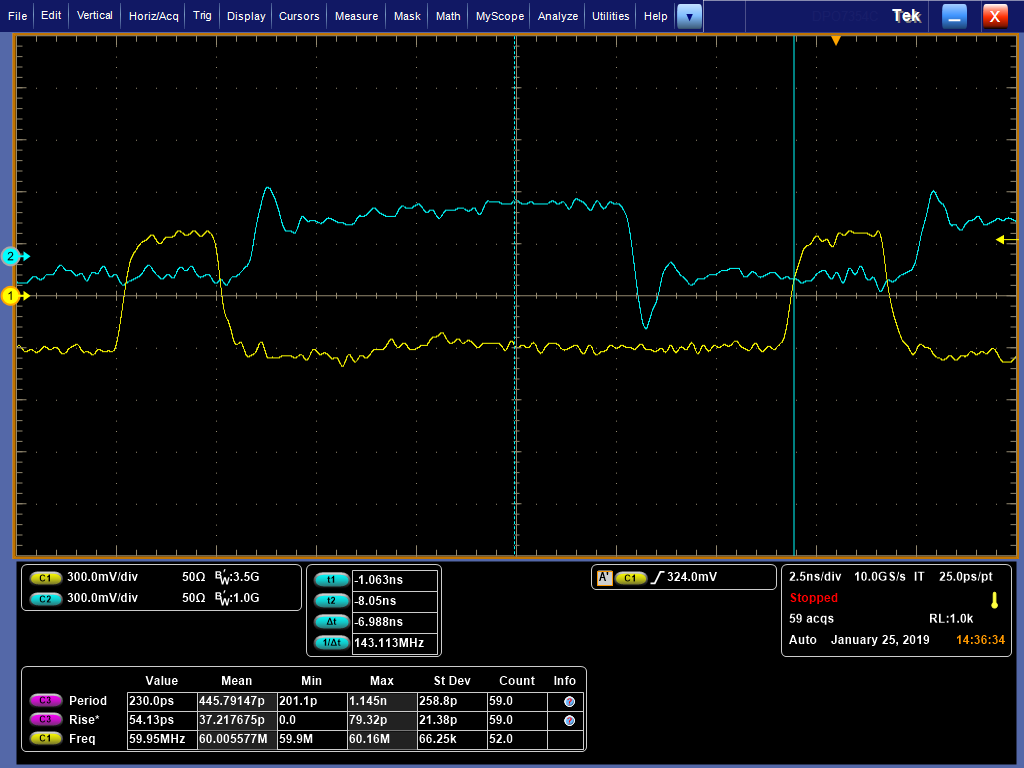 The blue signal is LVDS CLK, the yellow is LVDS data channel A0.