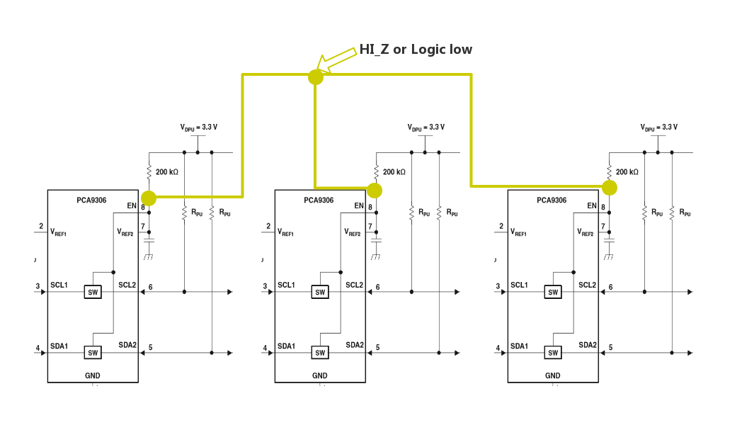 customer wants to use one signal to control several PCA9306 EN pin, then the 200K pull-up resistances would be in parallel. Is there any concern about this? If this is ok, how many PCA9306 devices could be controlled in this way? Thanks!