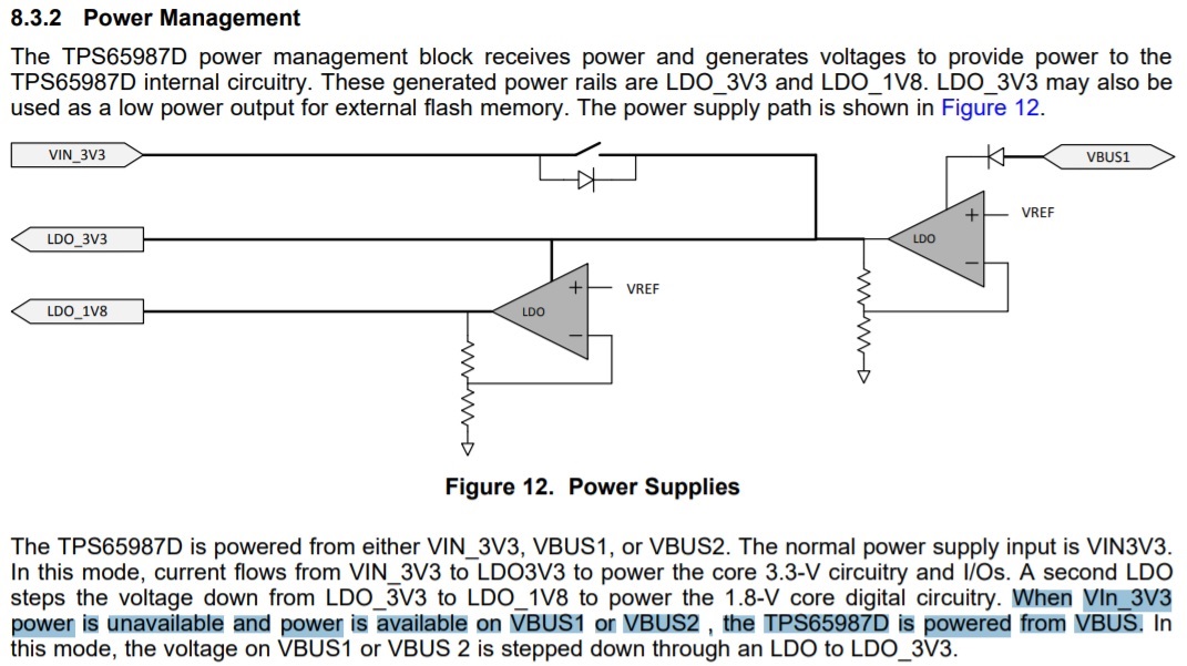 In this project, TPS65987DDJ is used as DEVICE (with no other external power and battery) where the power is coming from USB Type C VBUS connected. Based on the datasheet section 8.3.2, it mentioned that, when VIN_3V3 is unavailable and VBUS/VBUS2, TPS65987D can be powered up.