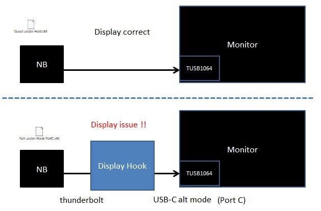 1) please review the logs and teach why make the TUSB1064 behavior different?
