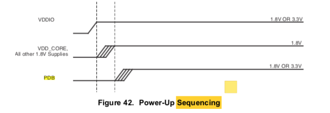VDDIO1, VDDIO2, VDDIO3 are pulled to a 1.8v rail ( 1V8A ), and VDDD, VDDSSCG, VDDR, VDDCML0, VDDCML1, and VDDPLL are pulled to a different 1.8v rail (1V8B ). VSS is pulled to a shared ground. The timing of the two 1.8v rails is 1V8A comes up first, then 1V8B after. The time between the two is hundreds of microseconds.