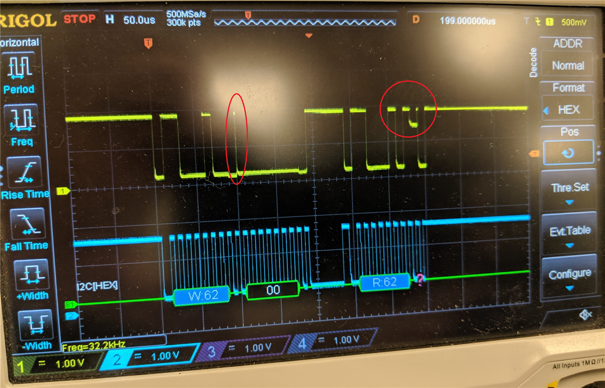 SDA and SCL are driven from a TCA9803DGKR with no pull-ups on the "B side" of the buss. The "A side" has 2k pull ups.