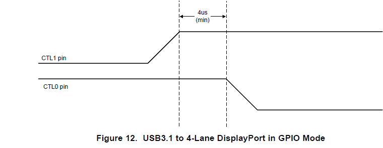 Originally customer is using their PD controller to control TUSB1064 under GPIO mode. Since there's some issue with their PD controller now, they need to manually control all related signals by adding wires. So the question is, is there any specific timing requirement to control related signals such as the figure quoted from datasheet below? Is there any simple guide for customer so that they can still verify their type-c port function when PD controller is not working? Is it true as long as they connect related signals (FLIP, CTL0, CTL1,....) to desired level in advance before the type-c device is plugged in?
