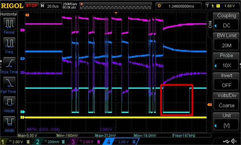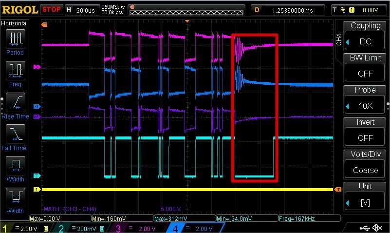 Ch1: RE, Ch2: R, Ch3: RS485 A, Ch4: RS485B, Math: A-B