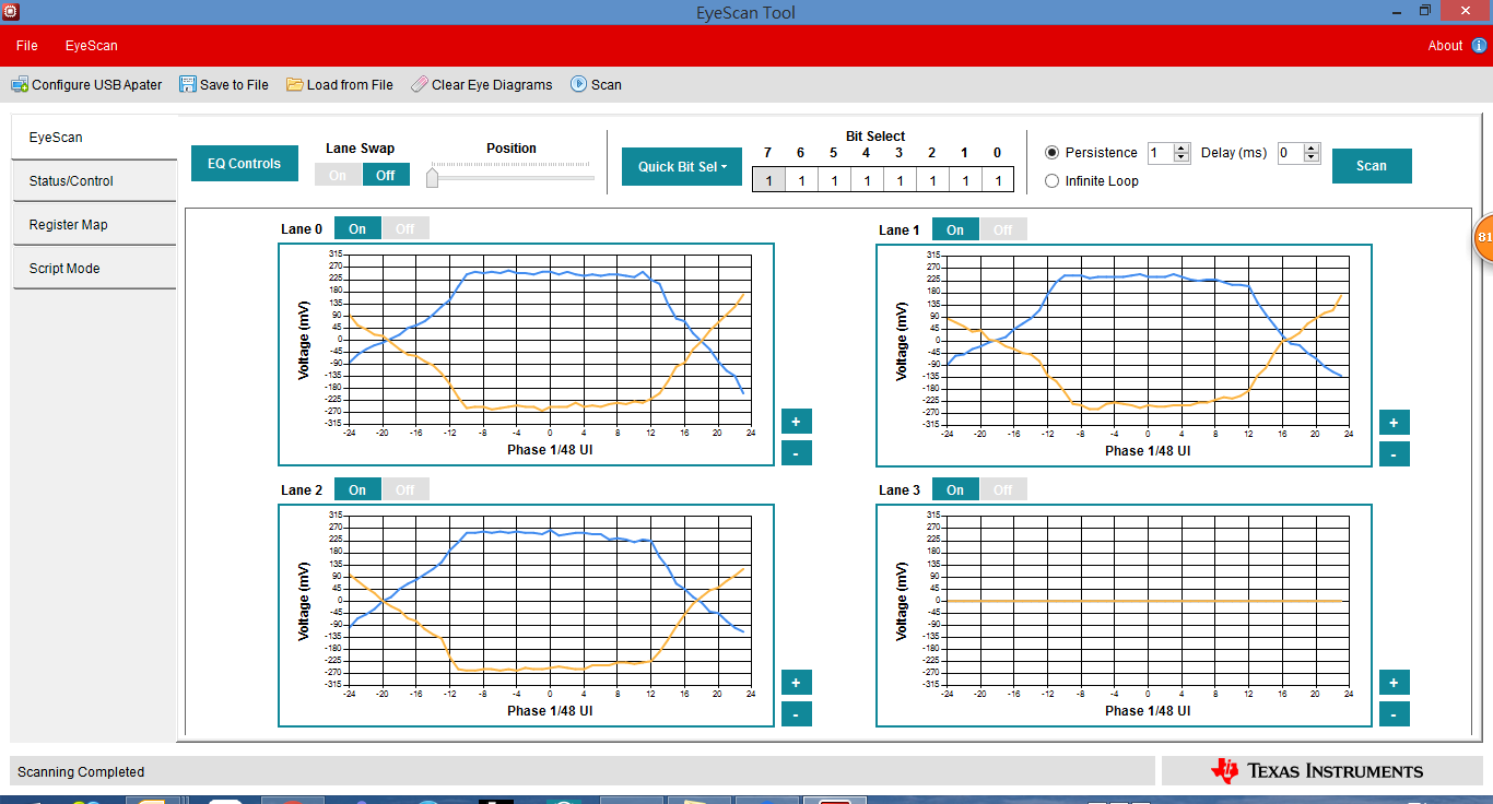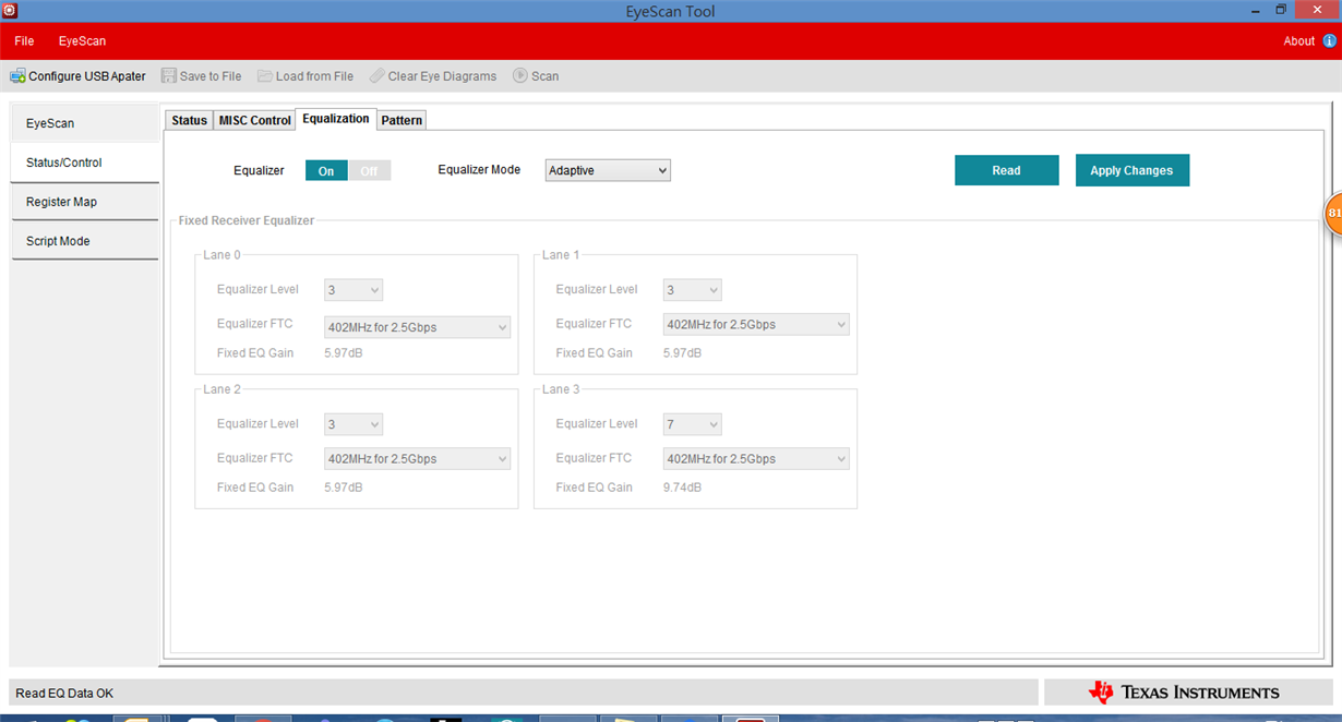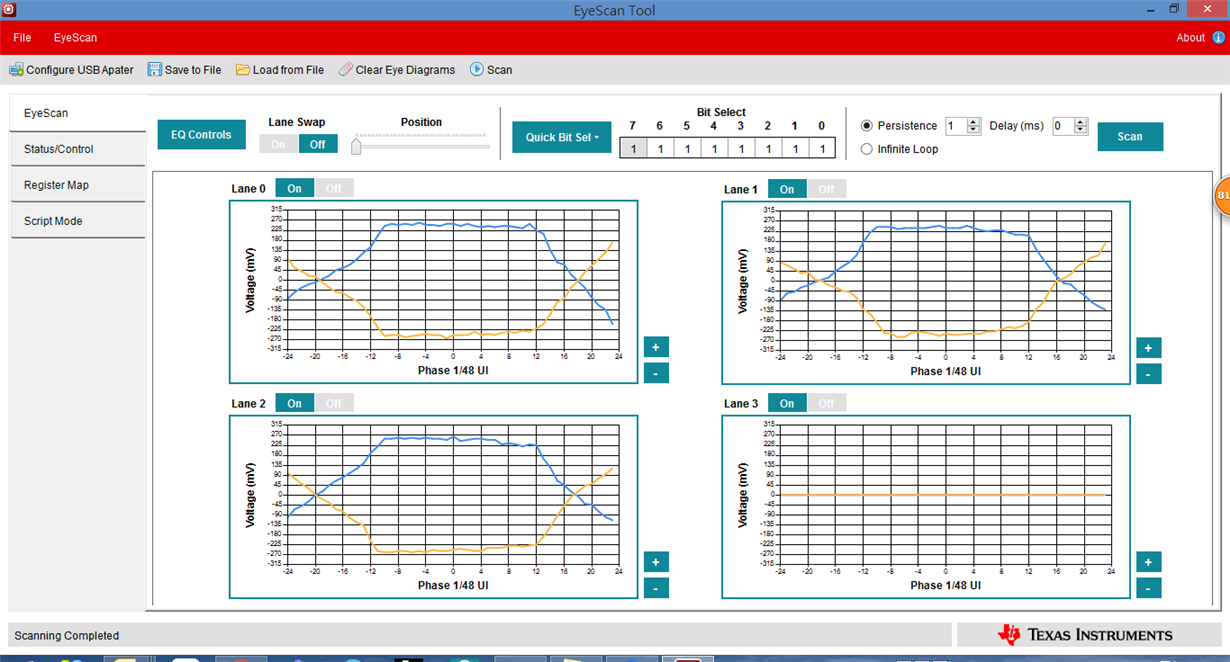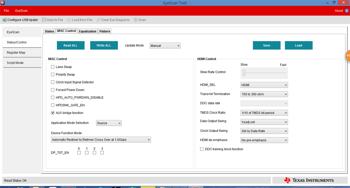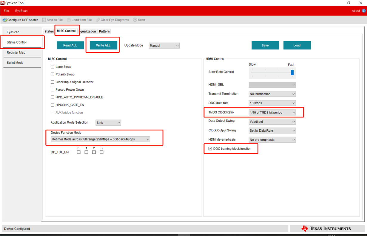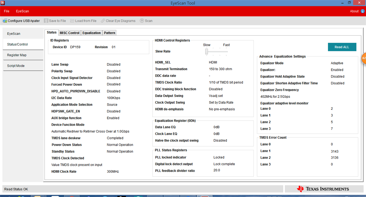 You need to set register 0Bh to DBh to change the TMDS clock to 1/40 of TMDS bit period and the termination to 75-150ohm required for HDMI 2.0 data rates. Please write the register manually in Page 0 of the Register Map section of the Eyescan tool. You will need to click "Write" after updating the register bits. Please also ensure that the I2C_EN pin is high.