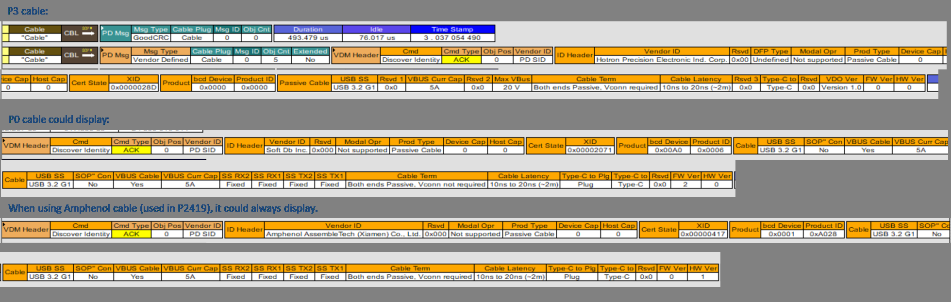 My customer is connecting a notebook to the monitor (using our TPS65987DDJ) with a particular cable and it always could not display.(other cable did not have such issue)
