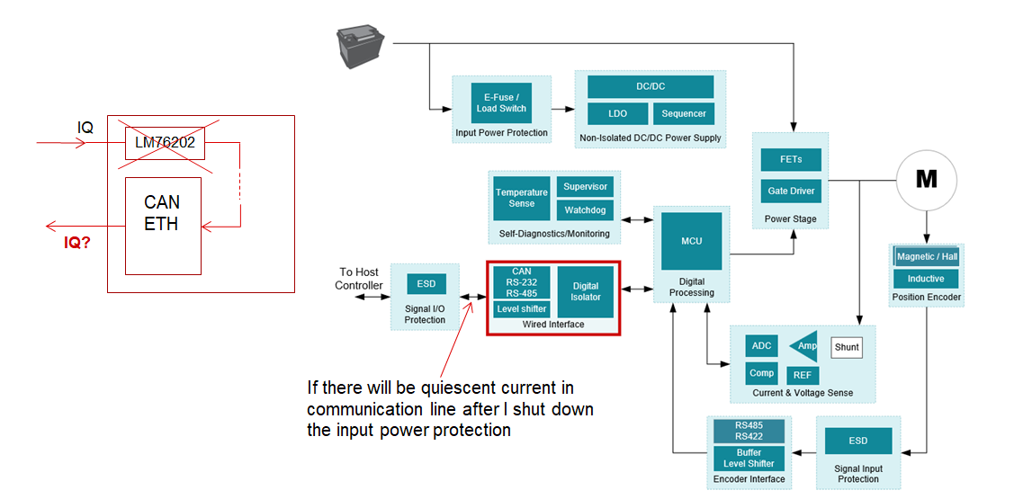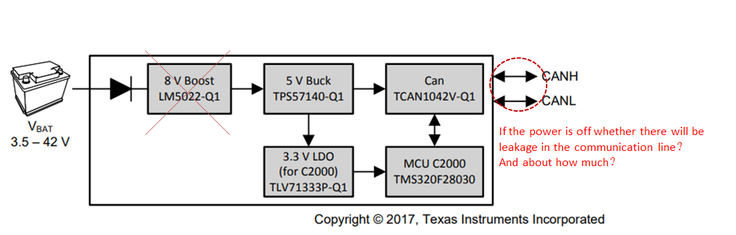 I’d like to know if there will be current in the communication line of the CAN after I shut down the input. The sample block diagram is shown on the left of the picture. The customer want a design with total Iq less than 100uA. The shut down current of the input protection device is about 50uA. We want to know how much losses are in the CAN. Could you help with this?