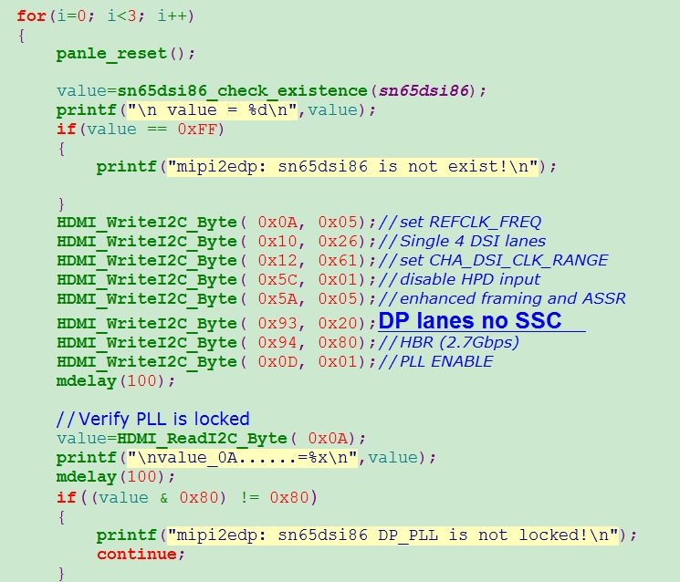 Our customer is using SN65DSI86 and found that it will report PLL unlock issue after register initialization, can you help to check what's problem in here?