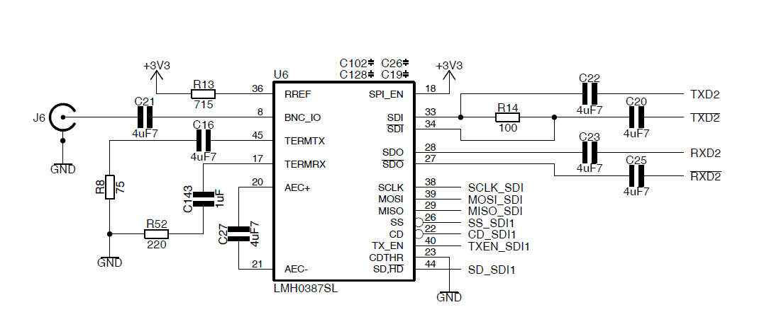 Now I want configure LMH0387s for SD-SDI but the transmitter does not work. The pin SD/HD is HIGH.