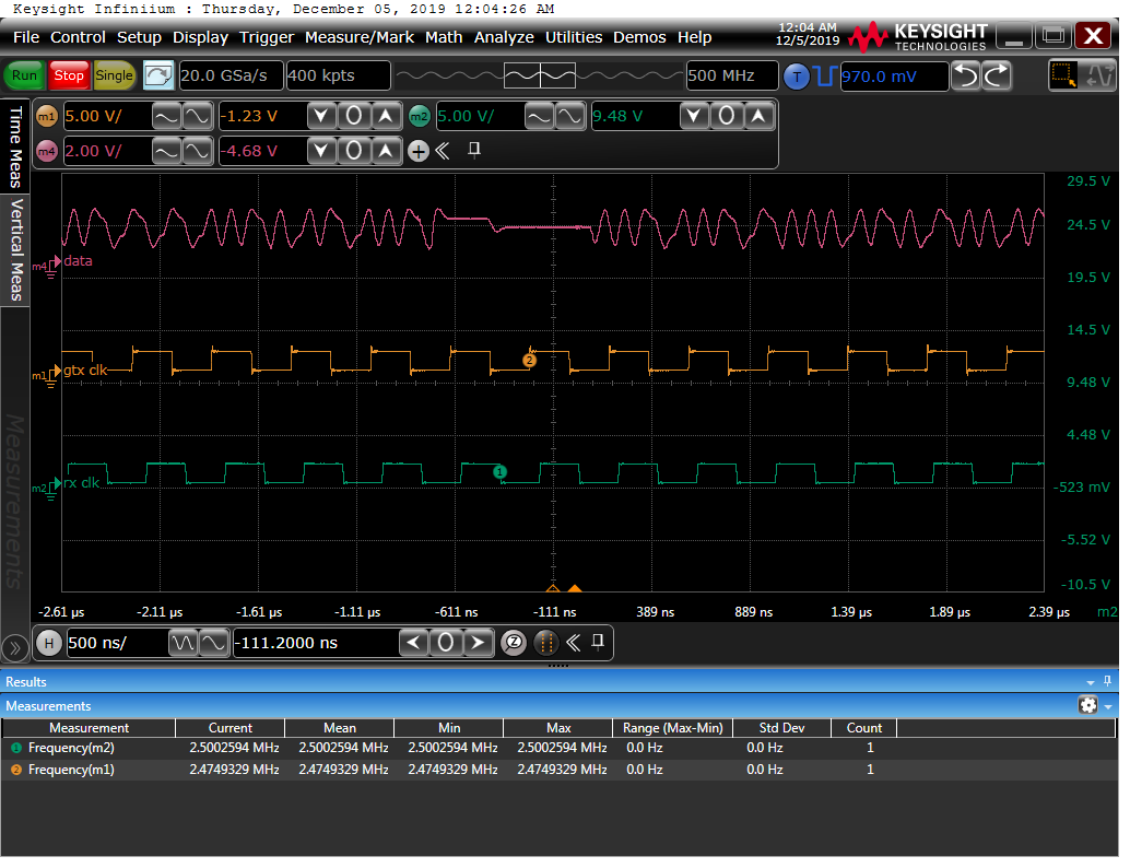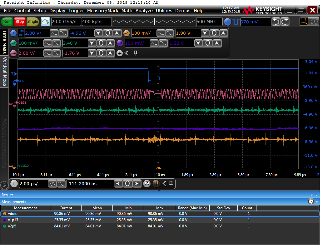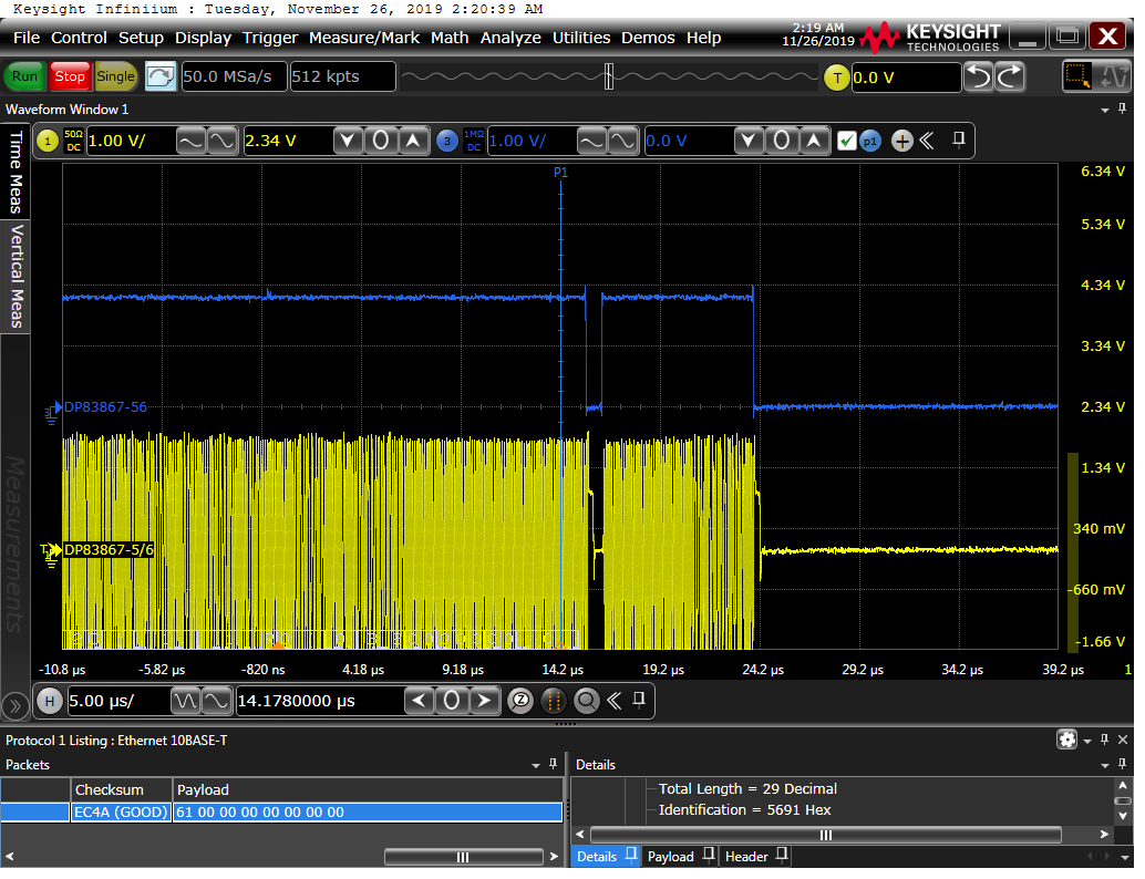 I am experiencing a data dead zone on Channel A from the phy to magnetics. Using a large data payload these dead zones will appear at uniform intervals of 80 us. The data stops for 800 ns then continues. Because this is so repeatable and the stop and restart looks identical from board to board or packet to packet there seems to be a mechanism within the device that is being tripped.