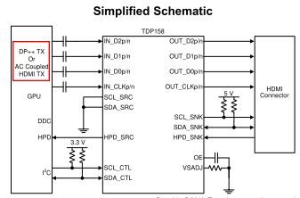 The TDP158 device is an AC-Coupled HDMI signal to transition-minimized differential signal (TMDS) Redriver supporting digital video interface (DVI) 1.0 and high-definition multimedia interface (HDMI) 1.4b and 2.0b output signals.
