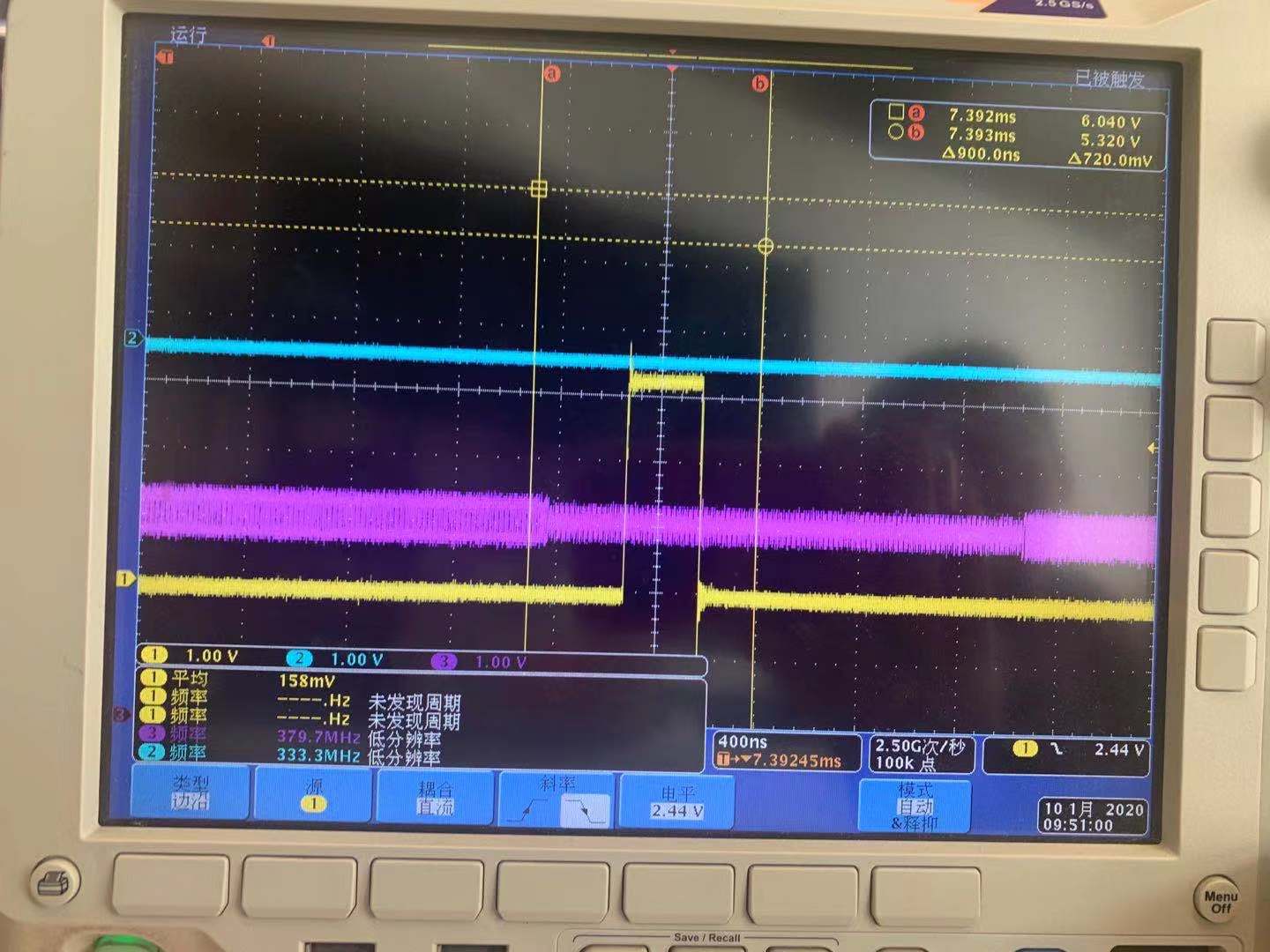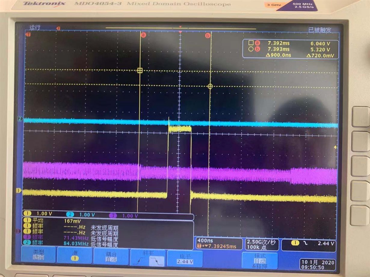 The following are oscilloscope pictures. The yellow one is HSYNC and the purple one is TX2 +.