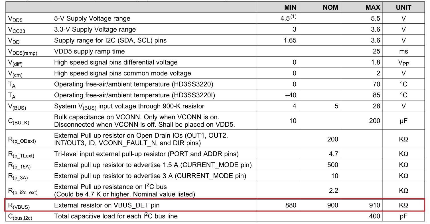 The datasheet tells this pin is used to detect the connection with resistor divider, I think the resistor with different value can be sued in theory if the VBUS_DET pin is within its EC table.