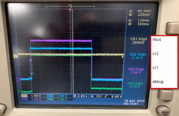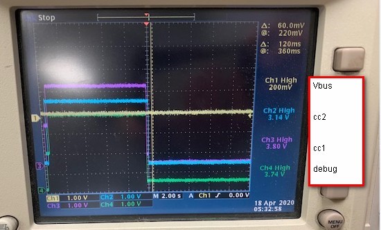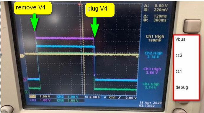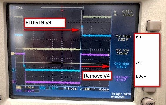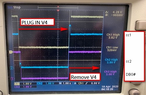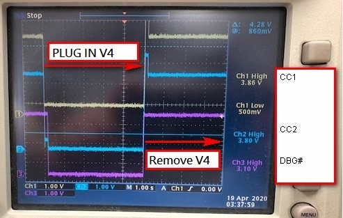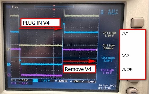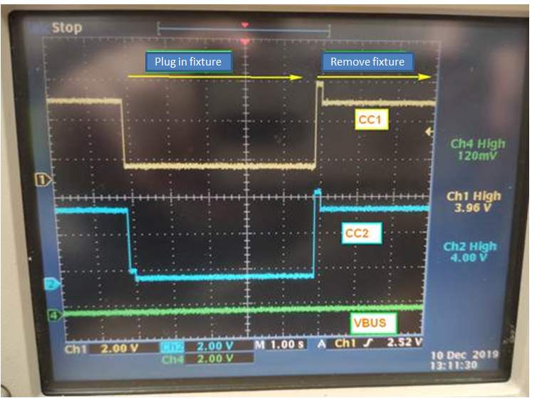 There's a specific type-c function fixture which is workable with other system (a DRP port), but not workable with the DFP port using TPS25810. Please check below for VBUS/CC1/CC2 waveform at the moment when the fixture is plugged in and removed. Please advice what we can check further to judge why there's not a valid 5V on VBUS when this fixture is connected.