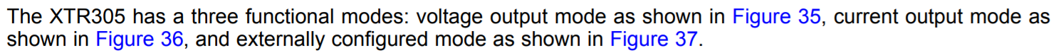 XTR305 has both Current and Voltage Output mode. In current mode as in Figure 36, it has the exact driving mechanism as XTR111. The current feedback feature is used only in Voltage Output mode, see Figure 35.
