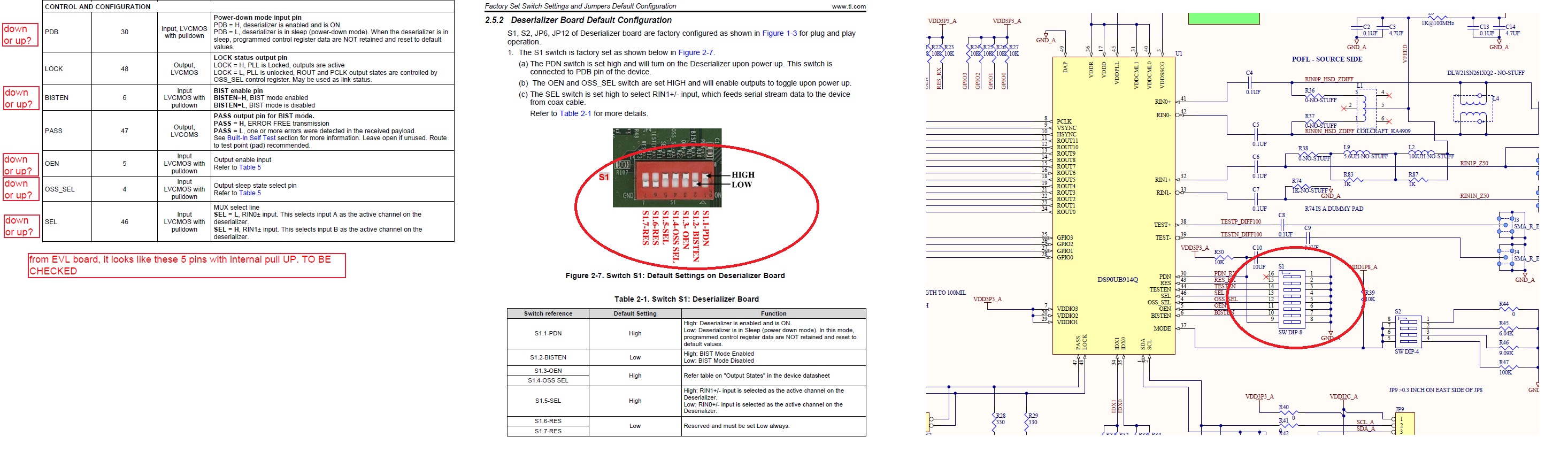We are to revise to a new board of Des.914Q (DS90UB914Q), which the last version did not work somehow. Now we have a confusion regarding the datasheet saying input pins PDB ,BISTEN., OEN, OSS_SEL and SEL "have internal PULL DOWN" (datasheet page 7)", However , from the EVL board it looks like these are PULL UP not DOWN. Please advise if it is PULL UP OR PULL DONWN? and what are these internal resistors' value anyway?