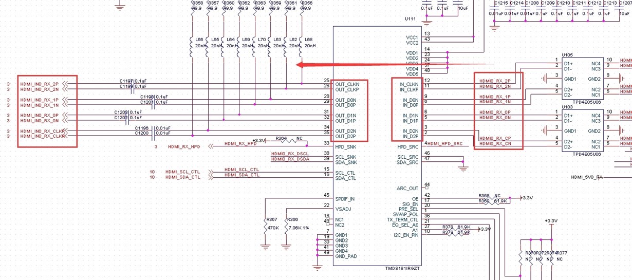 The HDMI interface chip TMDS181IRGZT was used in our project, but the PCB on the HDMI interface was disconnected during the design.As shown in the figure, we have swapped the data and the clock,