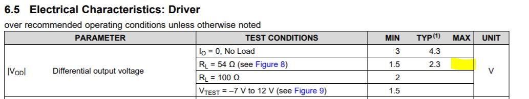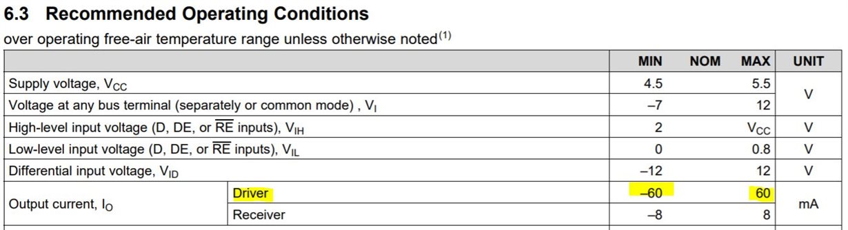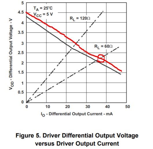 If we calculate the power consumption by using Vcc-0.5V and 60 ohm, it becomes 4.5V/60 = 75mA which is greater than the recommended condition.