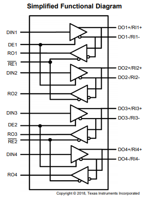 I'm interested in using the DS92LV040A for LVDS operation. In the Fig.1, it is shown that this supports receiving and transmiting using the same pair of traces. At the other hand, you can see, for example, DIN1 (Driver input 1) is unidirectional and RO1 (Receiver Output 1) is also unidirectional, and as is shown in the image for this I would need two independent pins for just DIN1 and RO1. (I'm asking about DIN1 and RO1, but I want to do that with the remaining pins too)