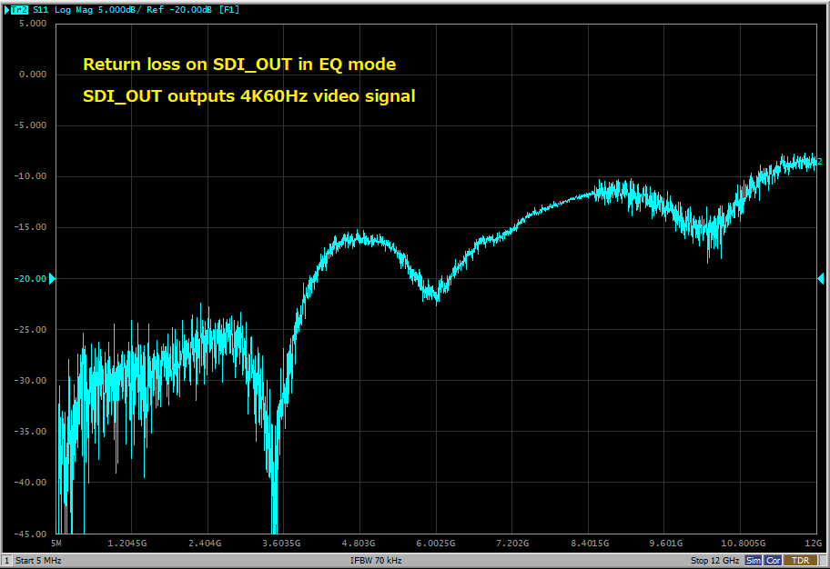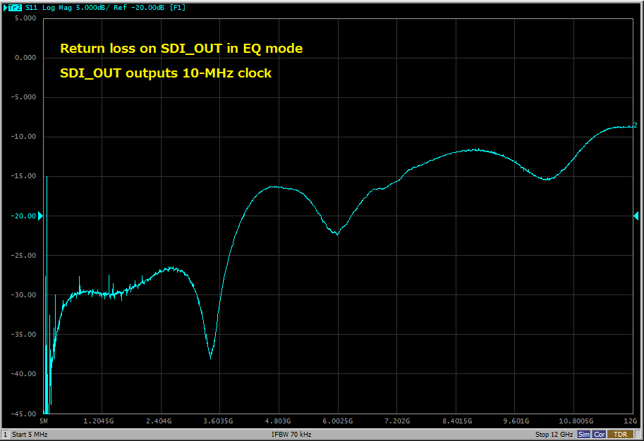 I set up device registers to transmit 10-MHz clock on SDI_OUT in EQ mode and SDI_IO in CD mode, and then I measured these return loss. But these Return Loss did not meet SMPTE standard. However these return loss met the regulation if I set up device registers to transmit 4K video signal.