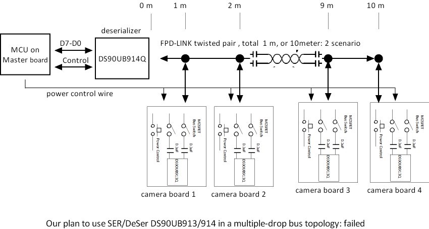 So our oringal plan is to use one DERS914 to communciate with one of the 16 camera boars at a time, by only powering on one specific camera board at a time. There is a MOSFET bus switch on each camera board, which apears open(high impedance) to the bus. The FPD-LINK bus is made of twisted pair wire, total length is 10meter. The mutiple camera boards are all hooked up to this bus all the time .Again, we wished it could work by using the approach "only power only one camera board(with Ser913" + bus switch"., Please refer to attahced drawing.