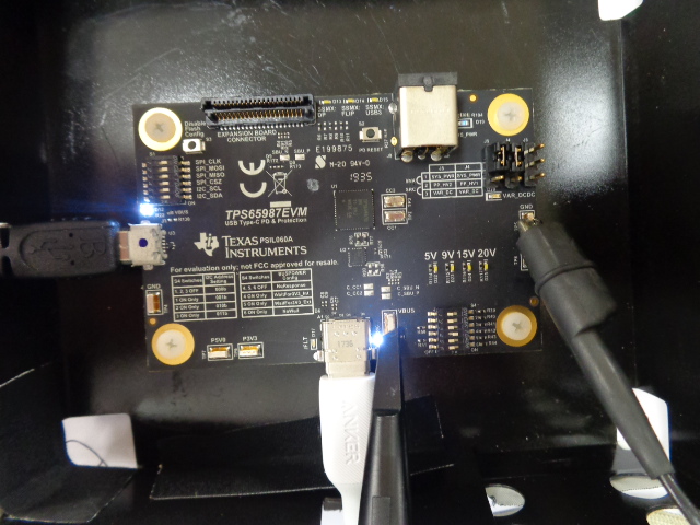 (1) When the TPS65987EVM with the following settings written in Flash and the AC adapter are connected by Type-C USB cable and AC100V is input, the voltage shifts at 0V, 5V, 20V.
