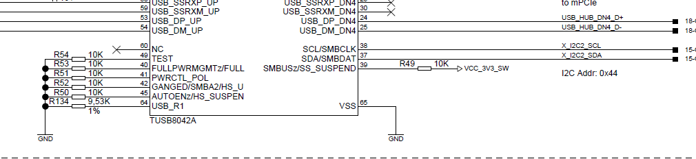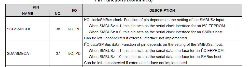 Ah, you are correct these devices leave the SDA/SCL pulldowns enabled after power on reset, the other configuration pins are released. To use the I2C interface you will need strong external pullups, 1K-2K. If you want to access the hub as a I2C device from an I2C host, SMBUSz should be pulled low. Please be aware that the hub will not connect as a hub in SMBUS mode until the I2C host has set the cfgactive bit in the hub register to exit configuration mode.