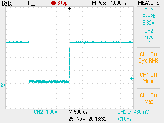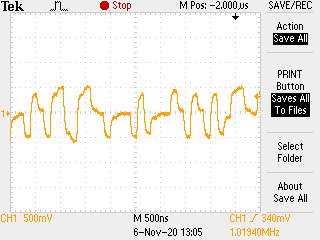 Below is a zoomed out CRO snapshot of the SPE pk-pk when there is a link LED_1 present for a few seconds before it drops off, and the pk-pk of this signal goes down to 1V, and then it continues to attempt again.