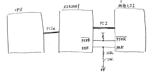 - With the CPU leading, a switch connects the PAR pin (connected to XIO2001 and LSI) to 0V via 12Ω resistor - forcing a parity error